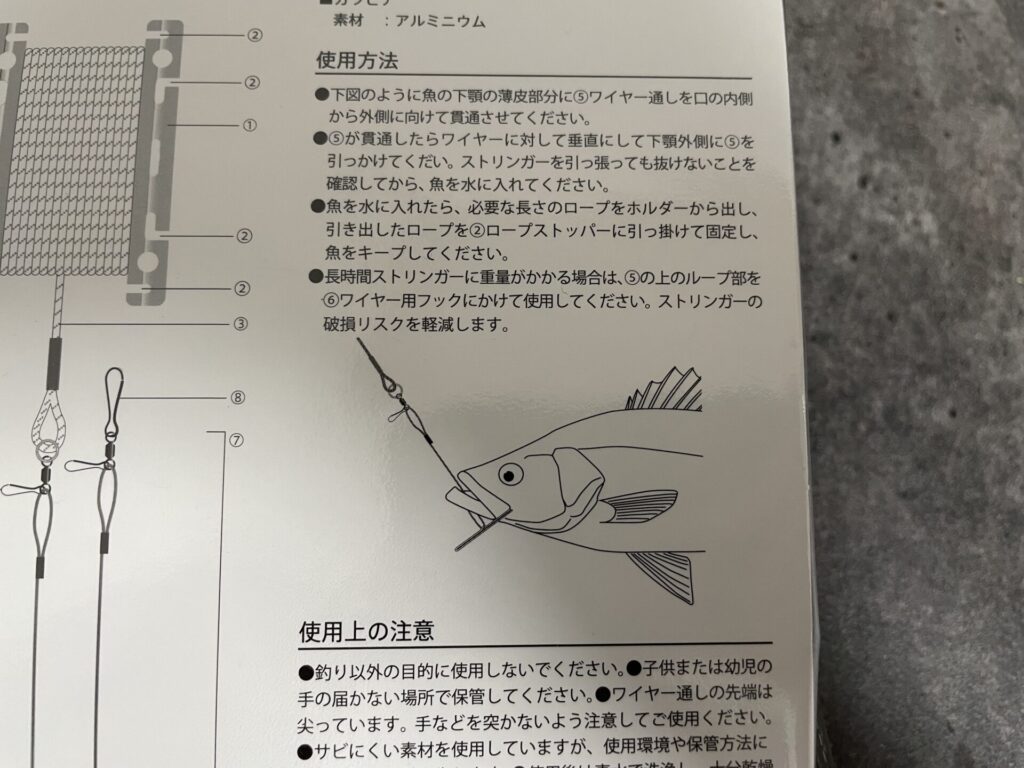 ③念のため、ストリンガーを引っ張っても抜けないことを確認し、魚を水に戻します。